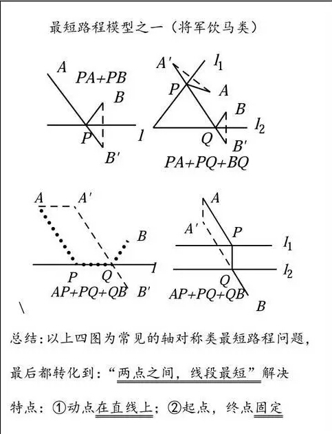 最短路線問題通常是以“平面內(nèi)連結(jié)兩點(diǎn)的線中,線段最短”為原則引申出來的。人們在生產(chǎn)、生活實(shí)踐中,常常遇到帶有某種限制條件的最近路線即最短路線問題.下面簡單談一下初中數(shù)學(xué)中遇到的最短路線問題。對于數(shù)學(xué)中的最短路線問題可以分為兩大類:第一類為在同一平面內(nèi);第二類為空間幾何體中的最短路線問題,對于平面內(nèi)的最短路線問題可先畫出方案圖,然后確定最短距離及路徑圖。